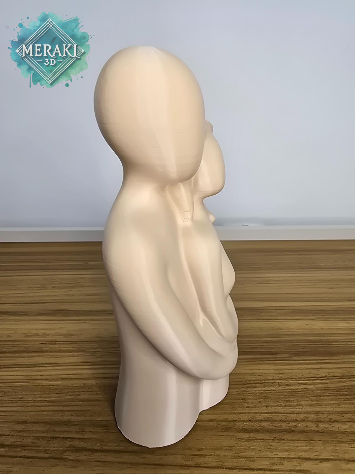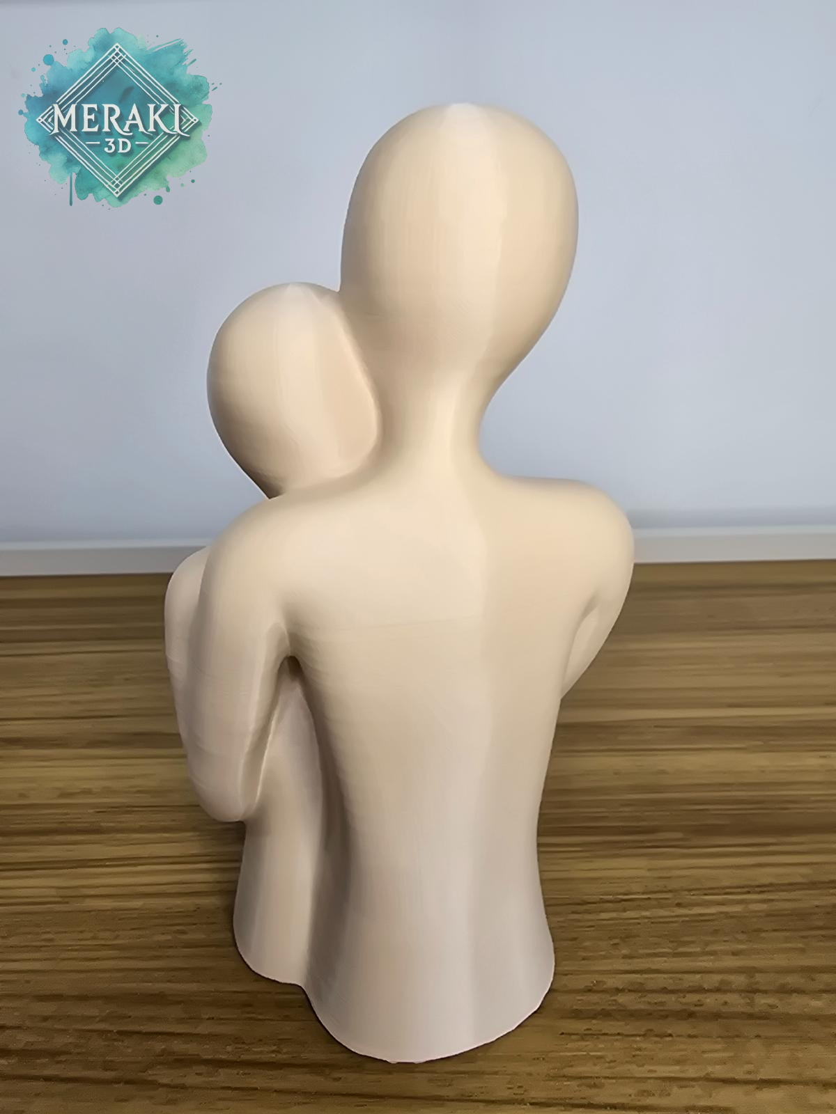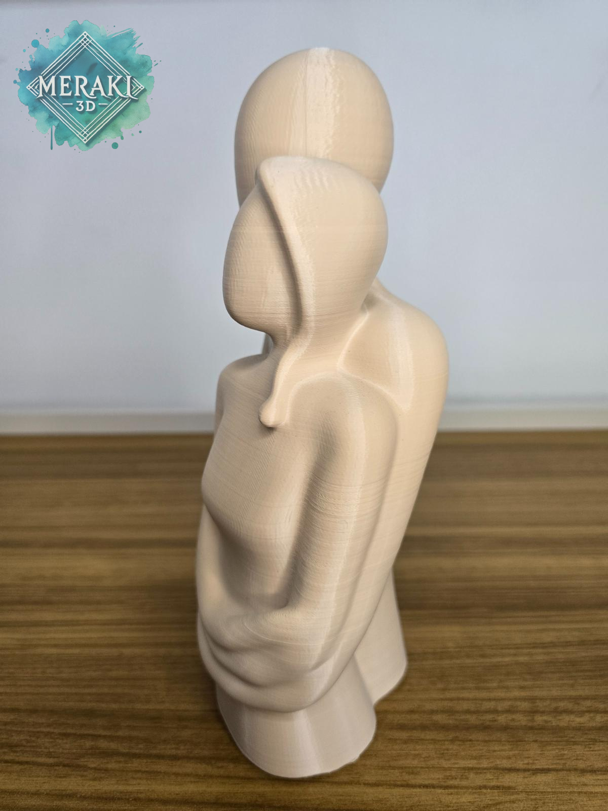 Escultura decorativa de casal em abraço, com design minimalista e acabamento em PLA bege claro. Peça artística moderna, ideal para decoração de ambientes afetivos e contemporâneos. Produção sob encomenda.