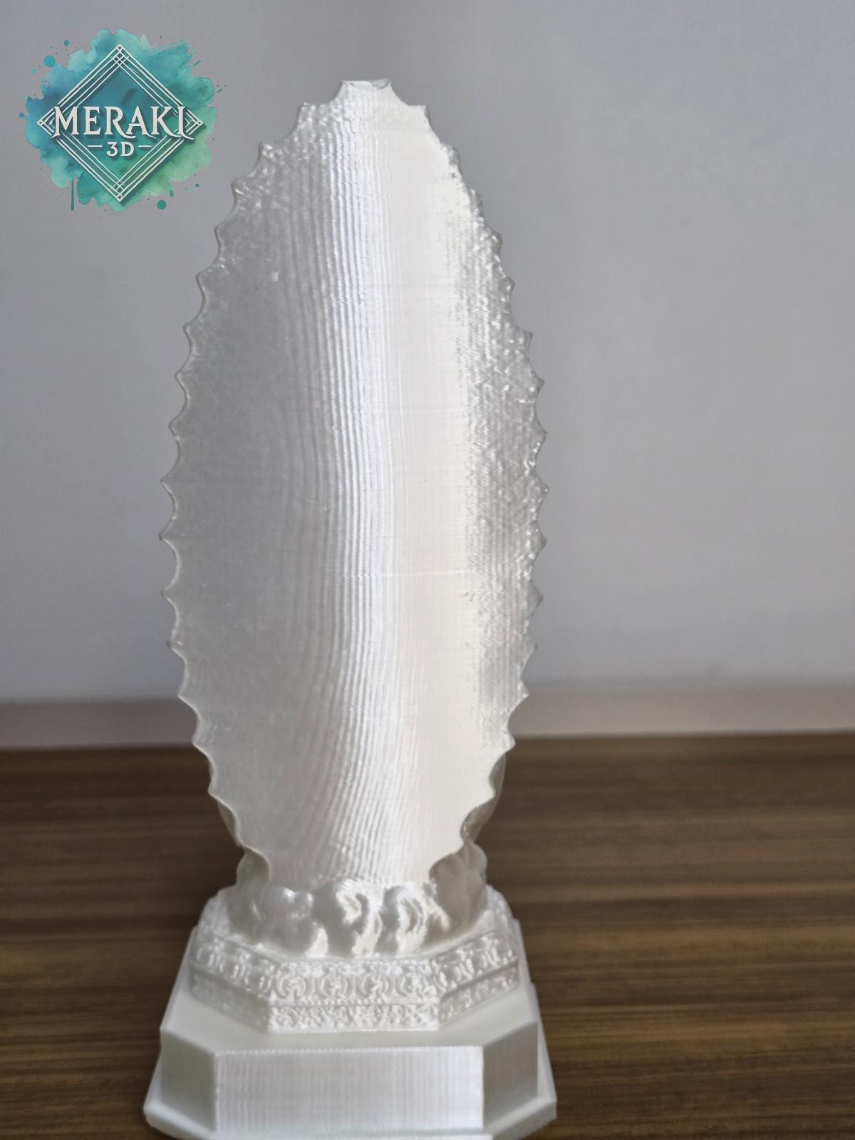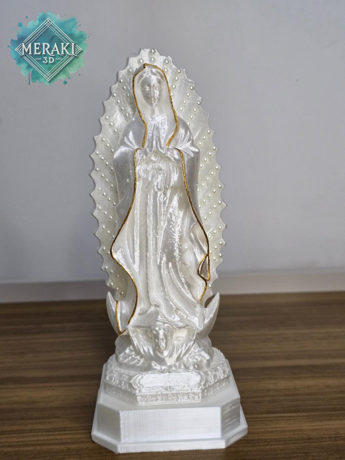 A Escultura de Nossa Senhora de Guadalupe é uma peça decorativa que representa fé, proteção e espiritualidade. Produzida em PLA por impressão 3D, possui acabamento perolado e detalhes em relevo que valorizam a imagem sacra.
