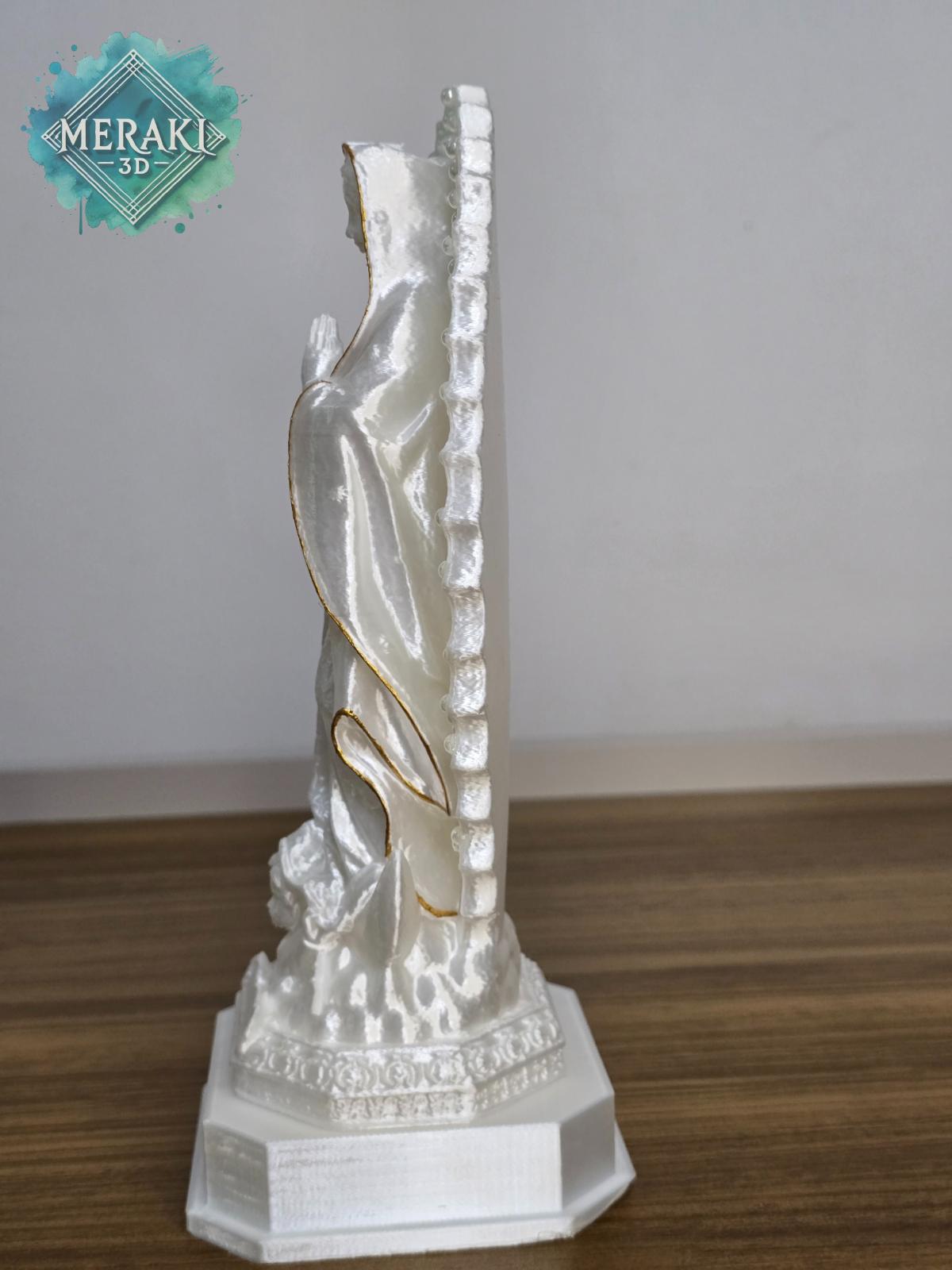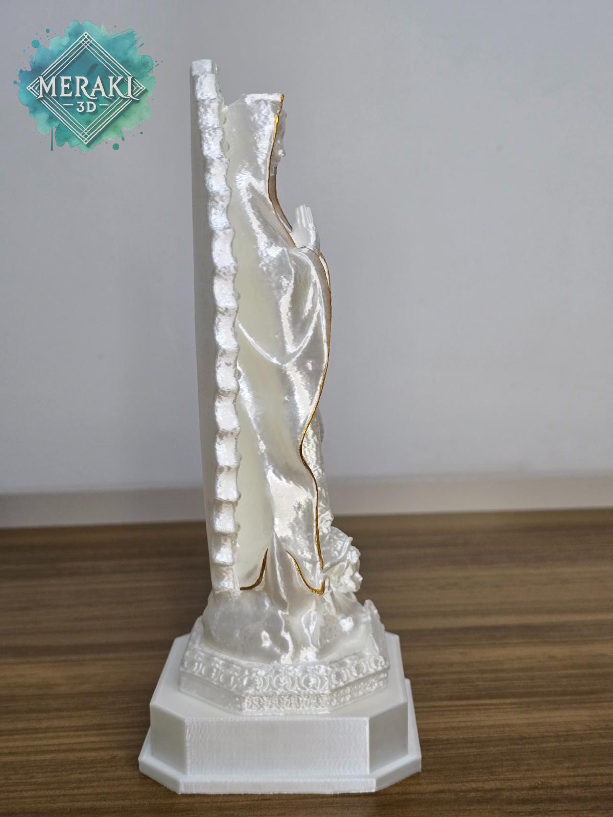 Escultura decorativa de Nossa Senhora, produzida em PLA por impressão 3D. Peça única, com acabamento perolado e detalhes delicados, ideal para ambientes de fé, oração e decoração religiosa.