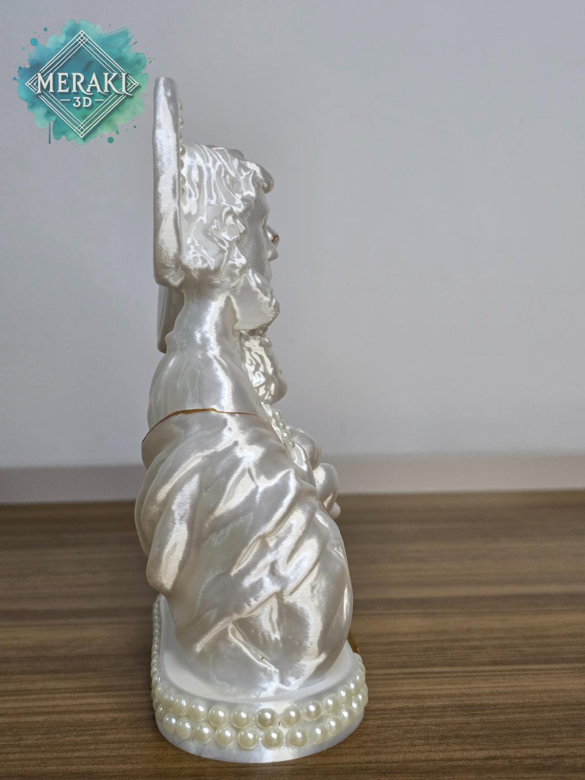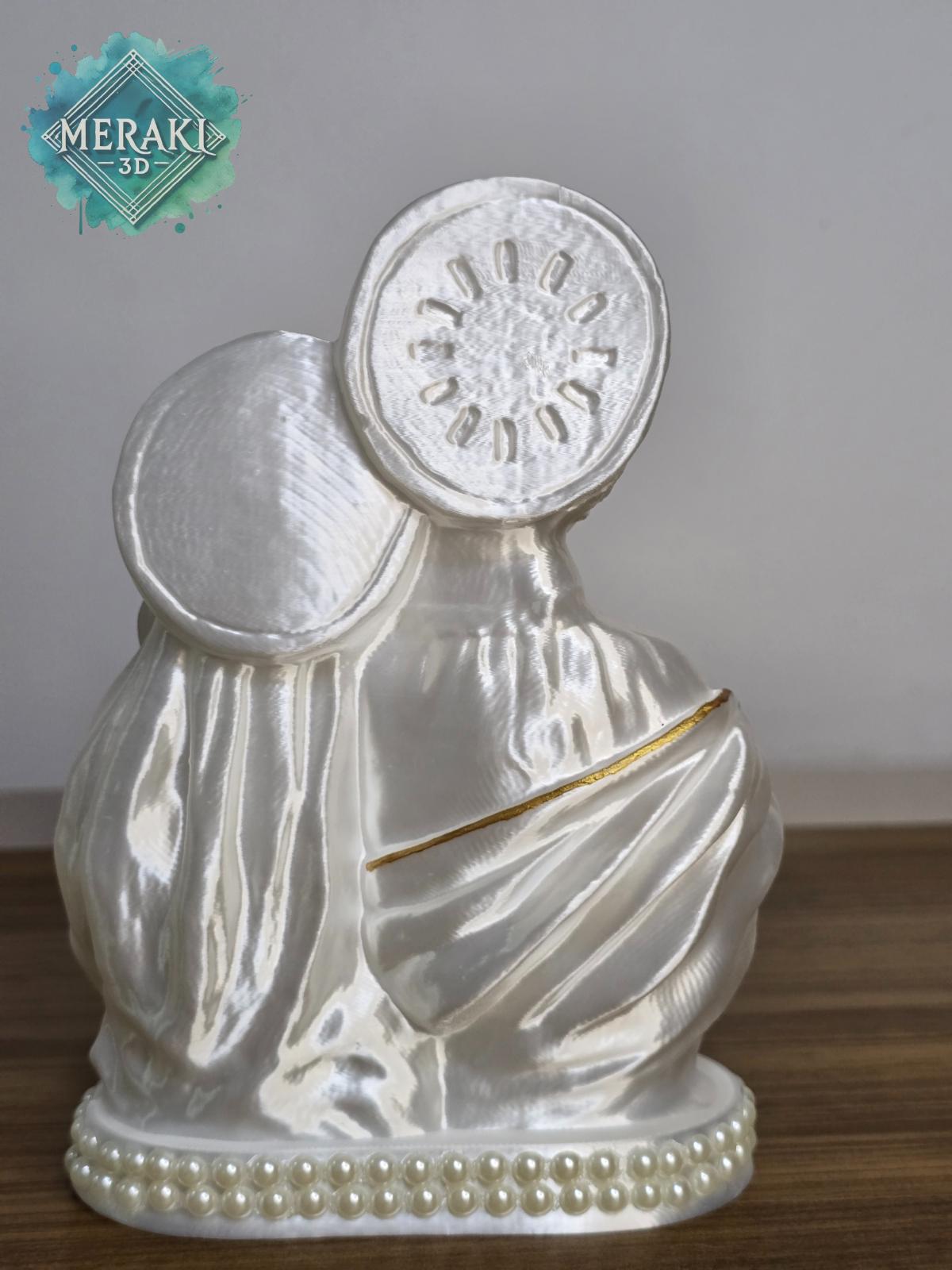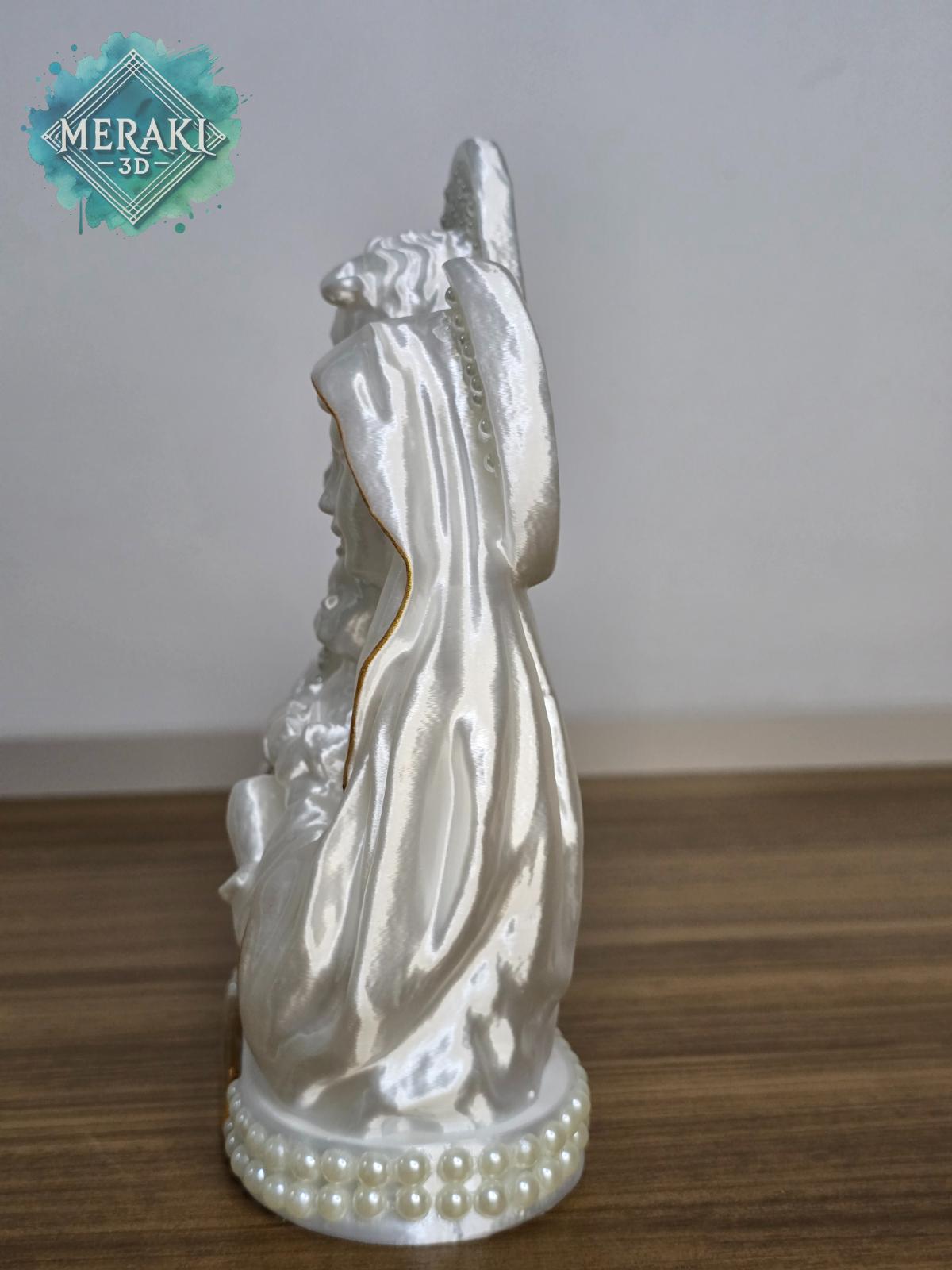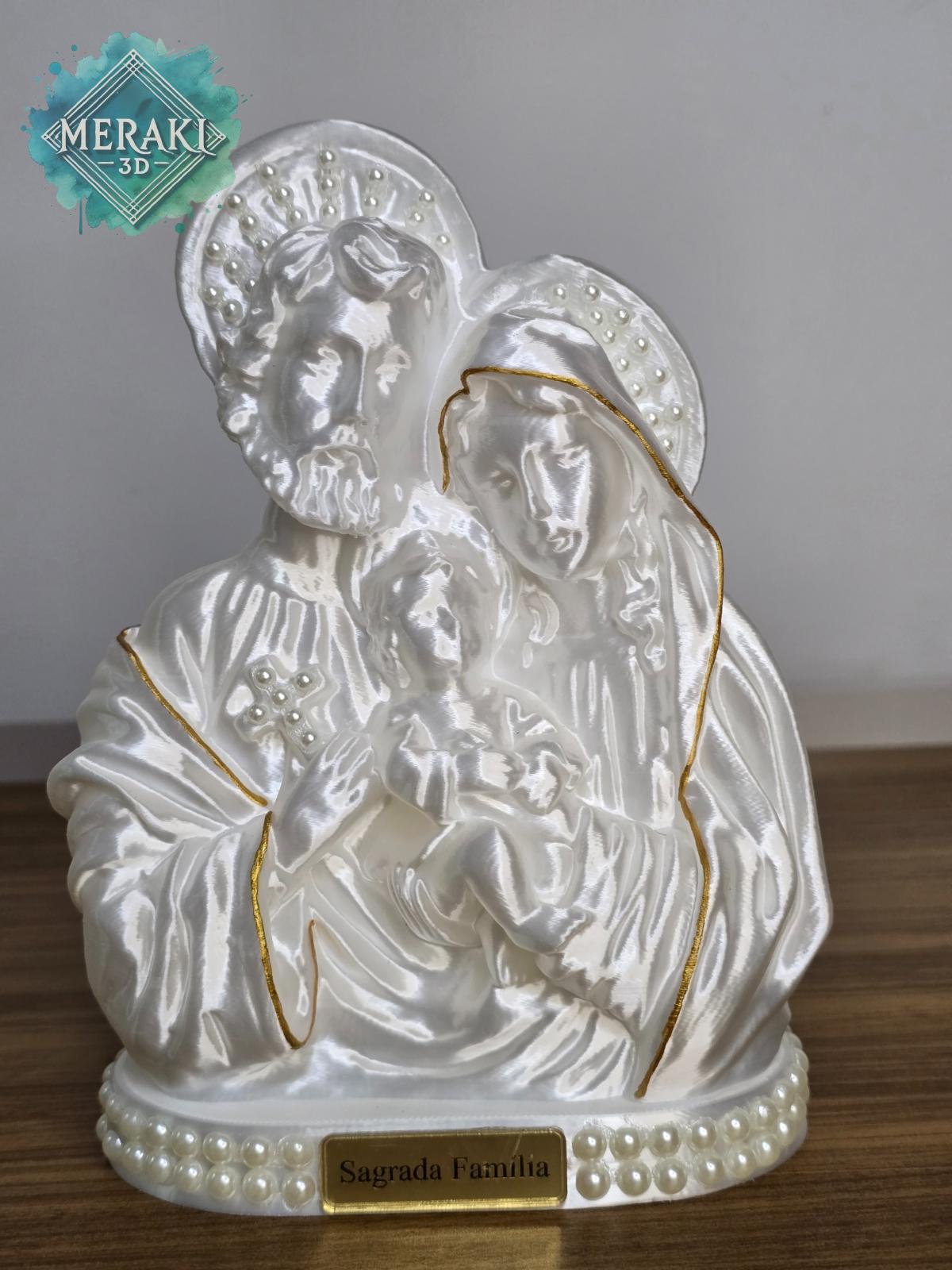 A Escultura da Sagrada Família é uma peça decorativa que representa fé, união e proteção familiar. Produzida em PLA através de impressão 3D, recebe acabamento branco perolado com detalhes feitos à mão, tornando cada unidade única.
