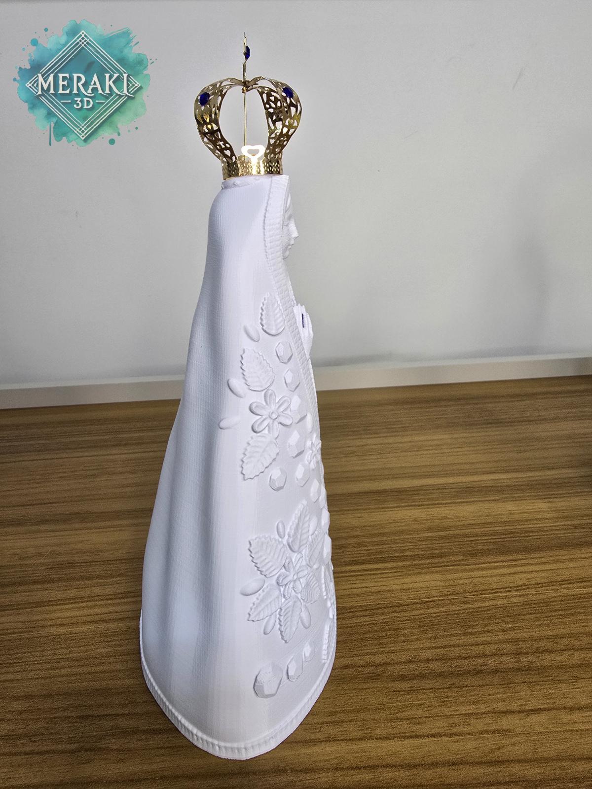 Imagem de Nossa Senhora Aparecida produzida em PLA branco, através de impressão 3D, com acabamento fosco natural e ricos detalhes em relevo no manto.