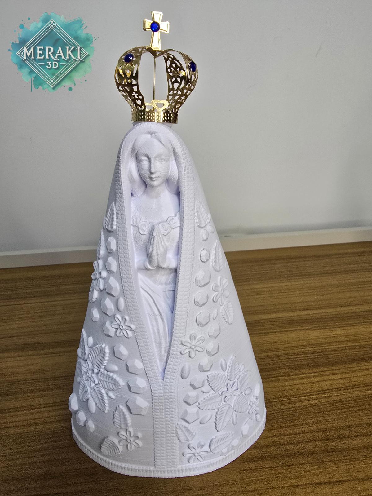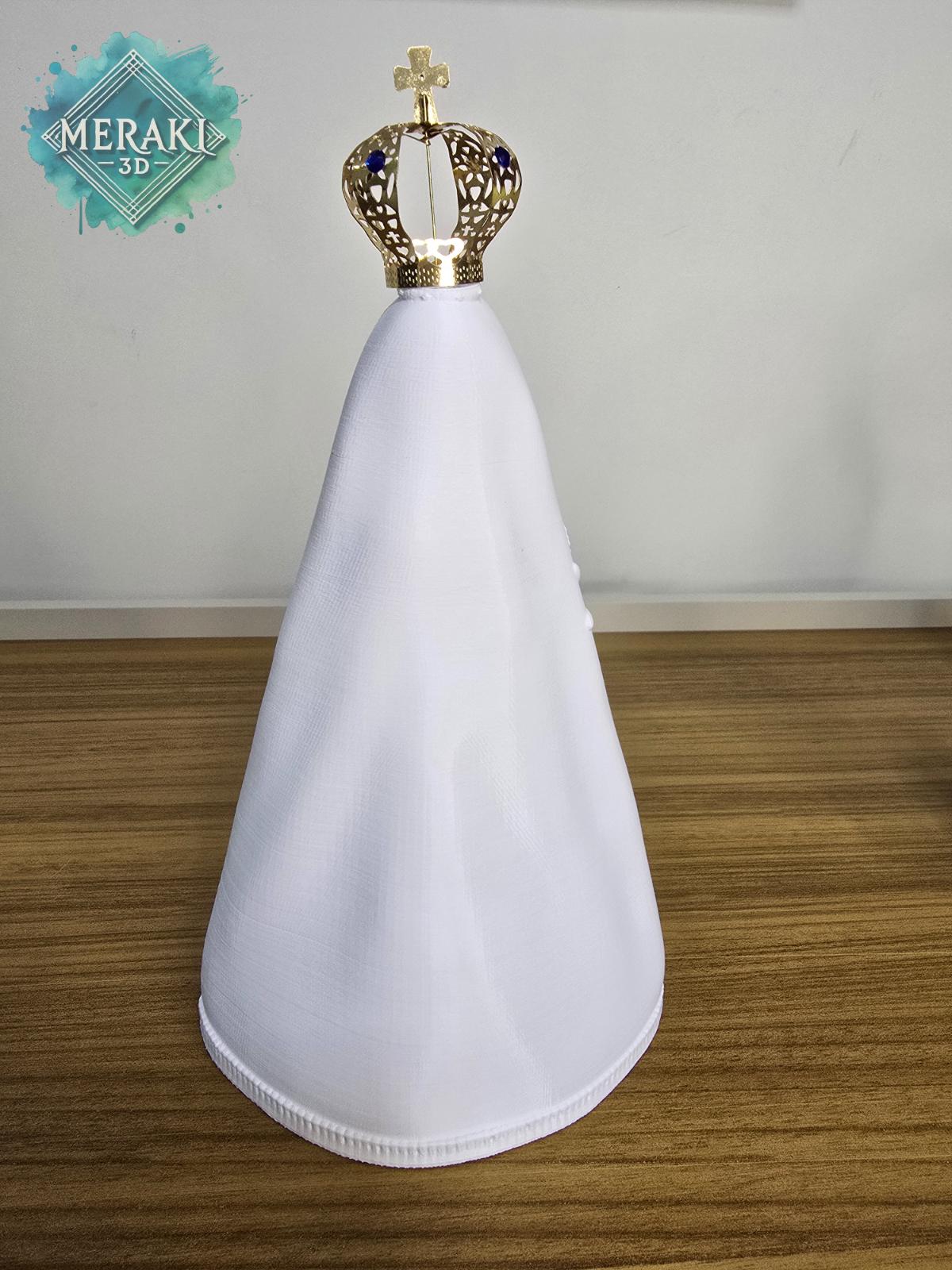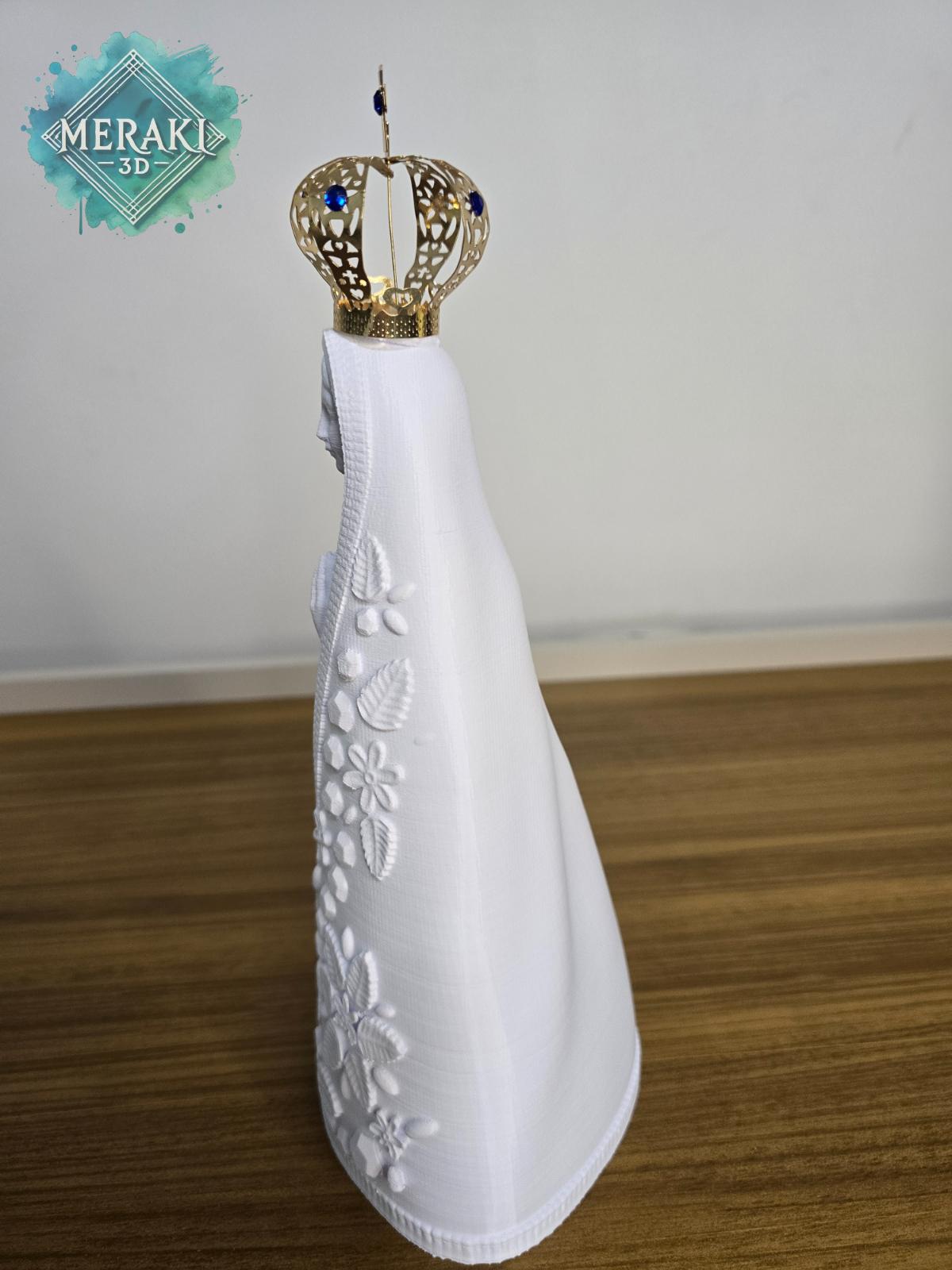 Imagem de Nossa Senhora Aparecida com 27 cm de altura, produzida em PLA branco por impressão 3D, com coroa dourada em metal e estrassos azuis. Peça devocional artesanal, sem uso de energia.