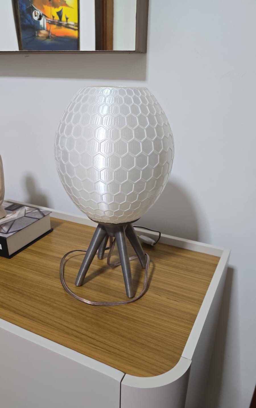 Produzida em PLA, possui cúpula com padrão colmeia que difunde a luz de forma agradável, criando um clima aconchegante. A base LED com alimentação USB facilita o uso em notebooks, power banks e adaptadores de tomada.